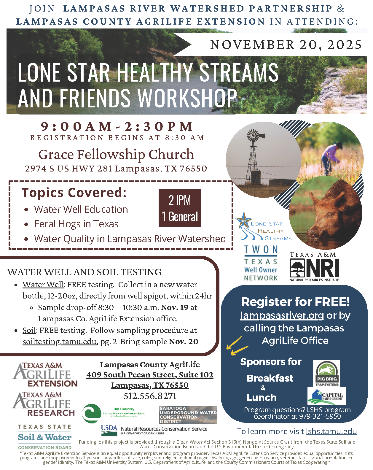 This workshop will feature the Lampasas River Watershed and local efforts to improve water quality. Topics covered will include basic watershed function, water quality and specific best-management practices that can be voluntarily implemented to help minimize bacterial contamination originating from grazing livestock, wild pigs and pasture weed management and private water wells. Participants will also learn about local resources for technical and financial assistance. The aim is to increase awareness, provide education materials to Texas producers and landowners, and encourage implementation.